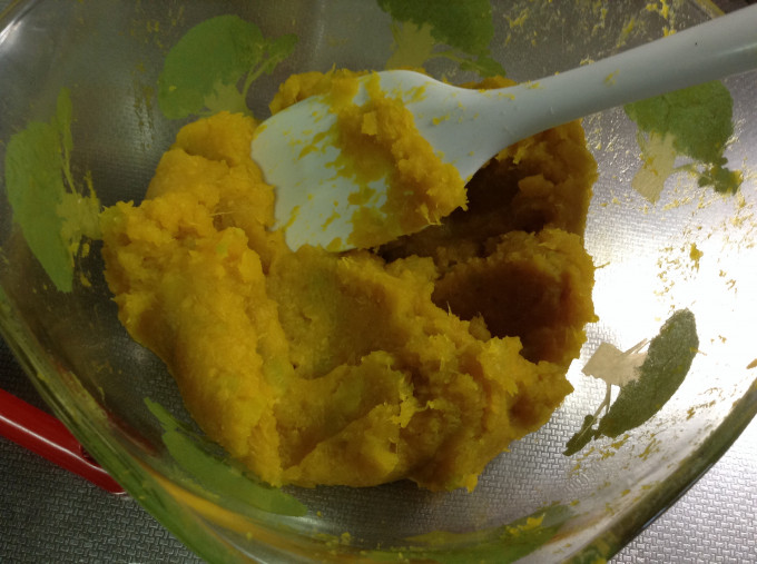 栗南瓜蒸熟去皮搗成泥,放入微波爐不加蓋或膜,加熱3分鐘,中途再翻一翻,讓水氣蒸發。這樣口感才不會溼溼的