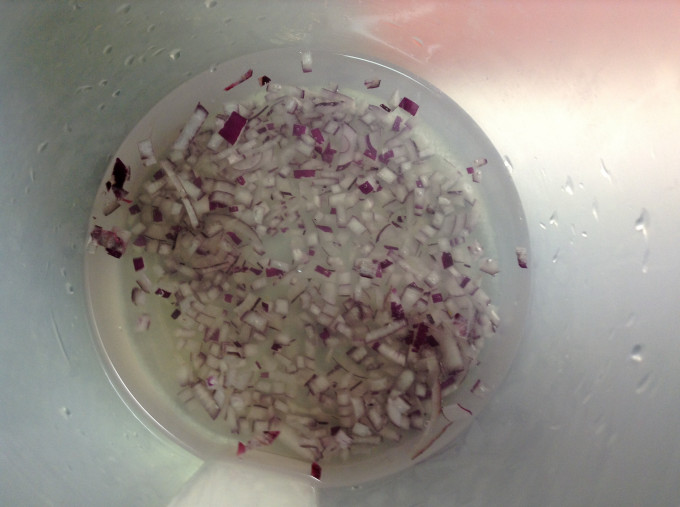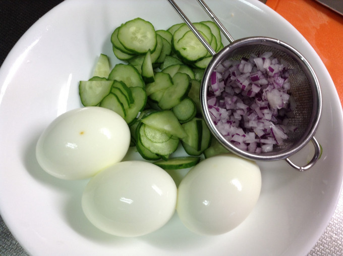 白煮蛋3粒,切丁。洋蔥切丁泡水去辛辣。