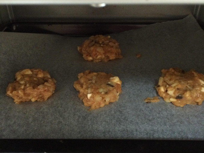 輕壓成圓餅狀,可用平底鍋煎或放烘焙紙上用烤的(烤約200度) 完成
