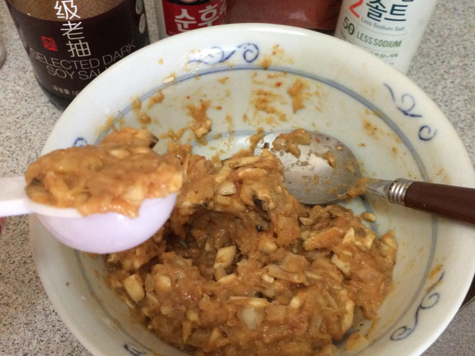 雞肉先剁打成絞肉,洋蔥、蒜切末,蘑菇切丁。 全部食材含調味料加入拌勻。 用15cc的匙當一顆肉餅的份量。