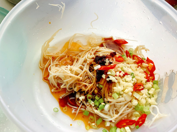 蒜切末;蔥切成蔥花;辣椒切小段。金菇針撈起瀝乾水份,加入醬油、糖、鹽、辣椒油、麻油、醬油膏、蒜末、蔥花和辣椒,拌勻後放入冰箱1-2小時。