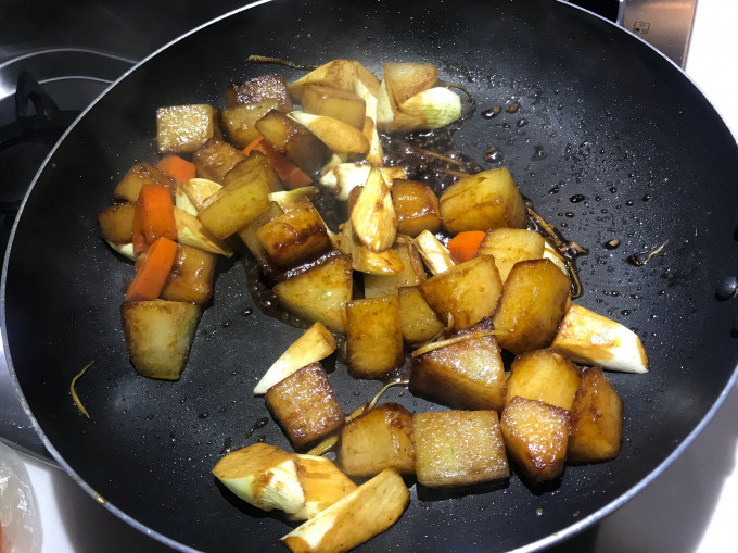 倒入甘樹子的湯汁(小罐)半罐。加入2湯匙醬油。炒一炒。均勻上色