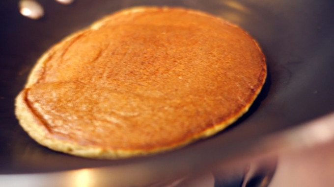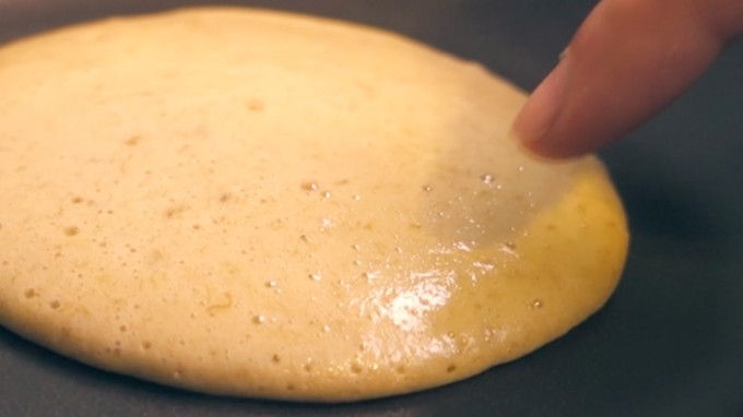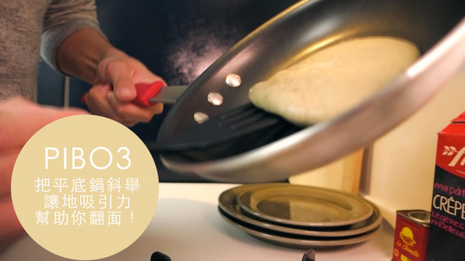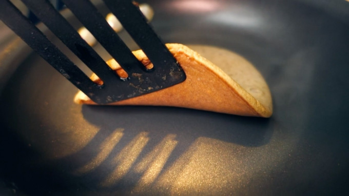 PIBO 地吸引力翻鍋法:把鍋具傾斜,讓鬆餅滑上鏟子,讓地吸引力幫助你翻面。