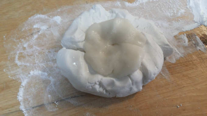 煮熟的麵糰(粿粹)與生糯米糰混合揉成糰,戴手套會比較不黏手好操作喔!