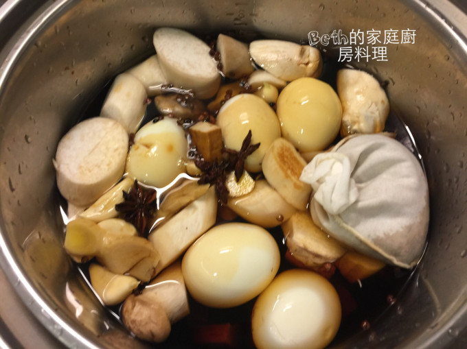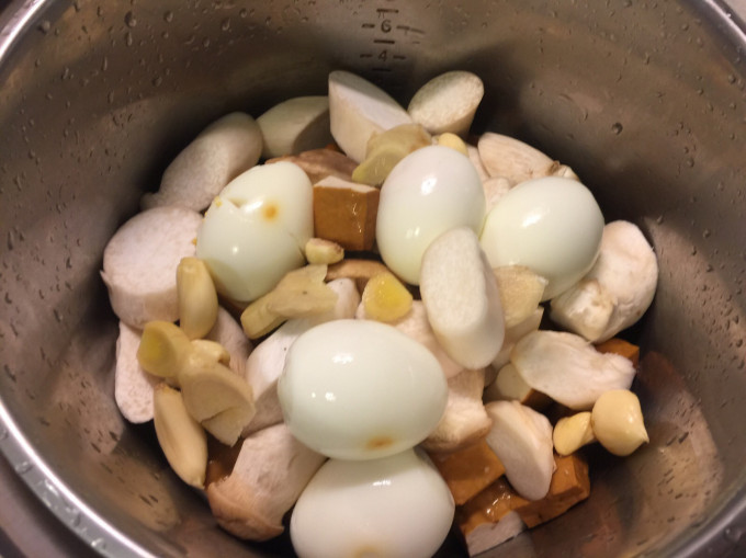 豆干切成4小塊、杏鮑菇切小塊,與水煮蛋、薑片、蒜粒(整顆不要切)放入電鍋內鍋