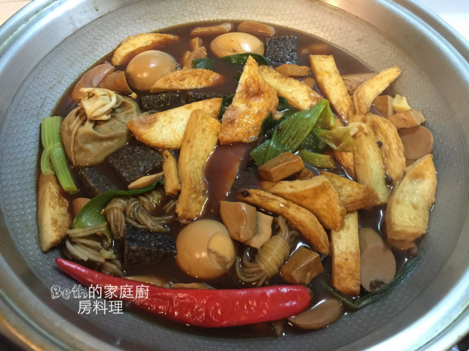 甜不辣切長條、米血糕切小塊與蒟蒻放入大鍋中,以中小火煮15分鐘