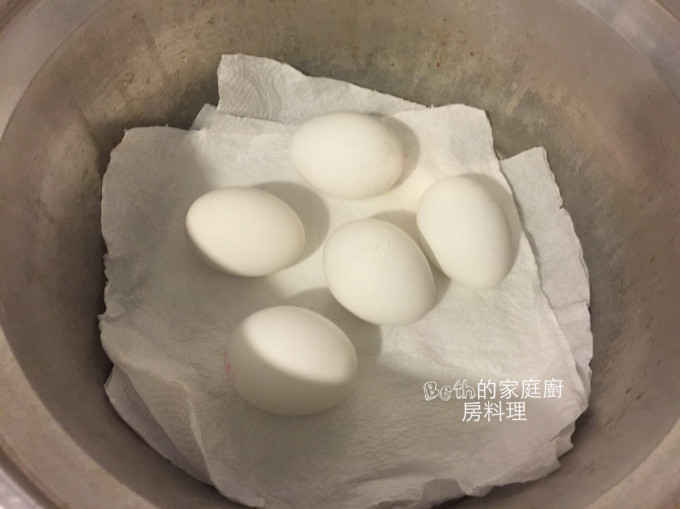 用電鍋煮水煮蛋:電鍋鋪上3張沾濕的廚房紙巾,放上雞蛋,按下電鍋跳起後,放涼剝去蛋殼備用