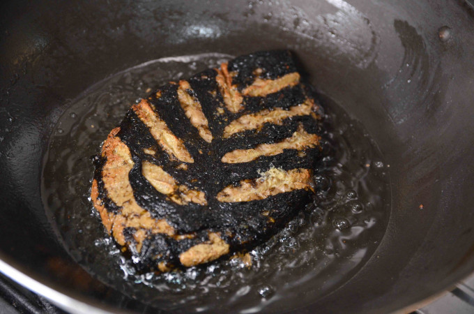 醬料倒在煎好的素魚上,再排菊苣圍邊