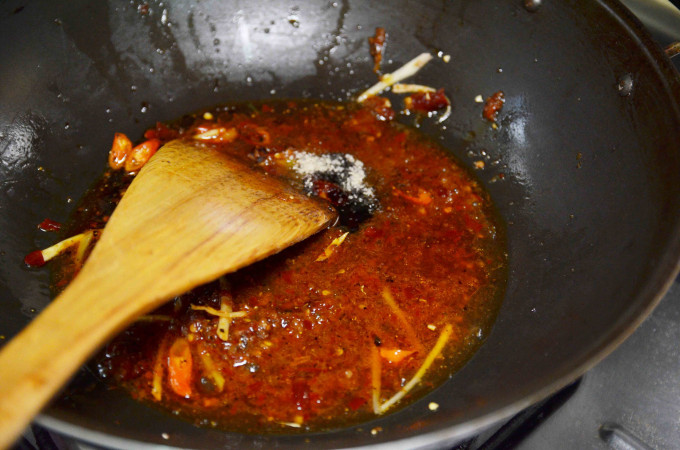 鍋中放入少許油,爆香薑絲、辣椒醬和調味料煮香